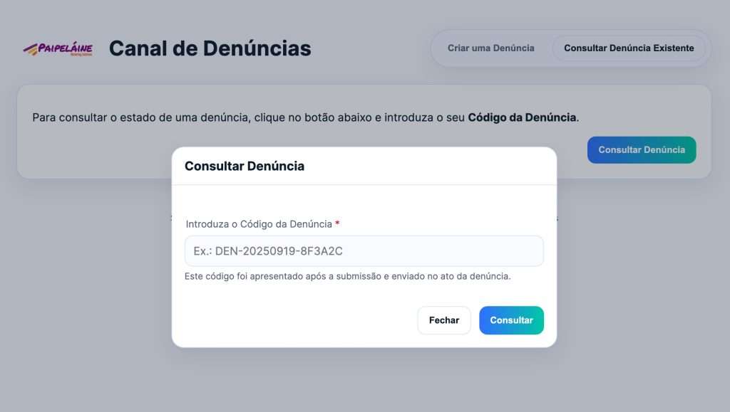 - Fluxo de acompanhamento, onde o denunciante pode ver o estado do seu caso.