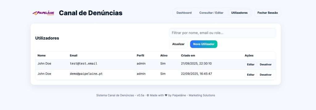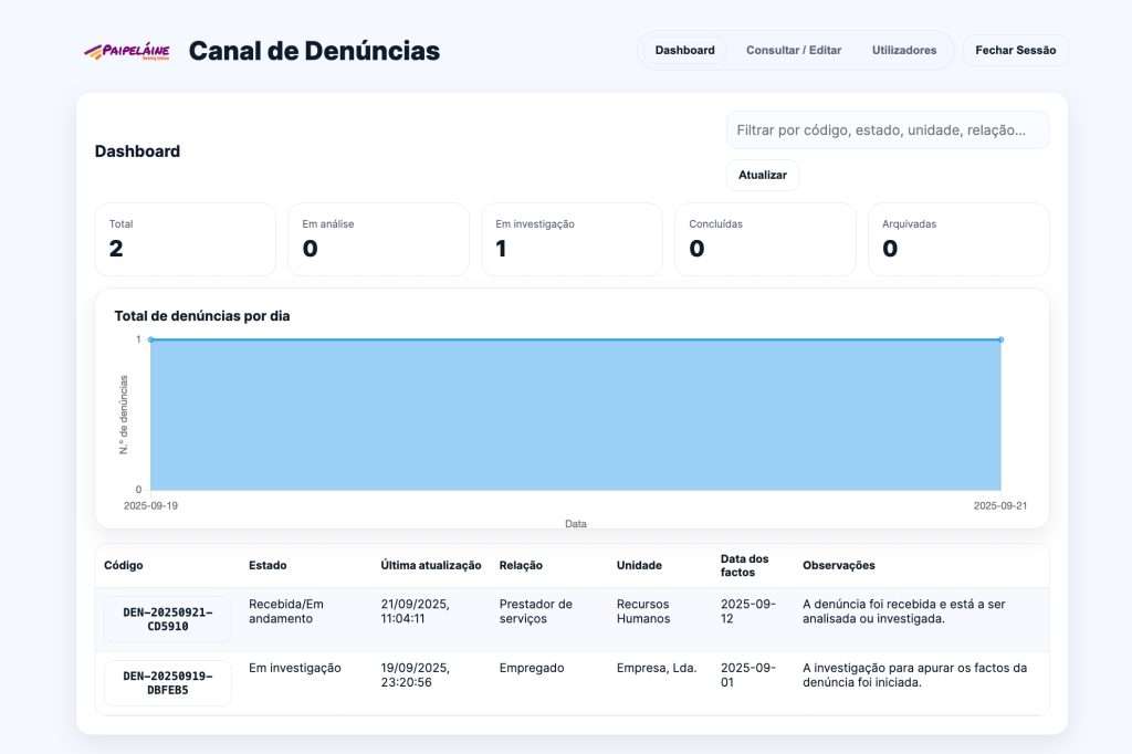 - Gestão de estados (“Recebida”, “Em análise”, “Em investigação”, “Concluída”, “Arquivada”).